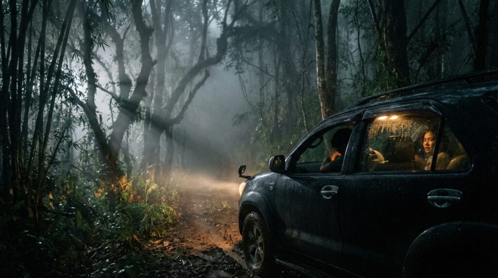 รถเริ่มชะลอลงโดยอัตโนมัติ ถนนแคบลง ต้นไม้เริ่มใกล้เข้ามา ไฟหน้ารถสะท้อนหมอกบางๆ ที่ลอยต่ำเหนือพื้น และมีบางช่วงที่เหมือนมีเงาเคลื่อนไหวอยู่ริมทาง แต่พอหันไปมองจริงๆ ก็ไม่เห็นอะไรชัดเจน ทุกคนในรถเงียบลงอย่างพร้อมเพรียง เหมือนต่างคนต่างพยายามไม่คิดไปไกลกว่าสิ่งที่ตาเห็น