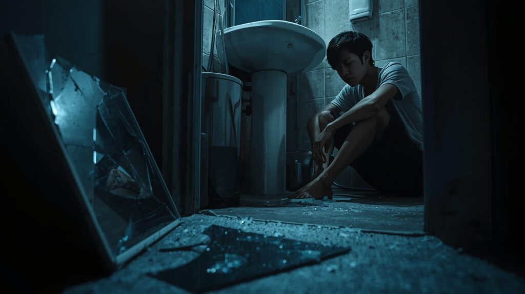 เสียงแตกดังสนั่น เศษกระจกกระจายเต็มพื้น ห้องน้ำทั้งห้องเงียบลงทันที เสียงกระซิบหายไป ภาพตรงหน้ากลับมาเป็นเพียงเงาของผมเองที่ยืนหอบหายใจด้วยความตกใจ